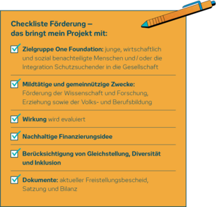 - Zudem werden keine rückwirkenden Projektkosten durch die One Foundation gefördert.